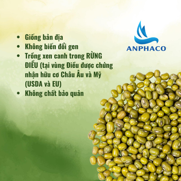 Đậu xanh hữu cơ không biến đổi gen Đồng Thuận – Anphaco là sản phẩm hợp tác giữa Anphaco và Đồng Thuận được hợp tác xã nông nghiệp Đồng Thuận trồng xen canh tại vùng điều hữu cơ đạt chứng nhận USDA và EU. Đậu dùng giống bản địa, canh tác sạch không hóa chất theo phương pháp hữu cơ. Sản phẩm sử dụng phương pháp hun trùng hữu cơ – Oxilow tạo môi trường không có oxi kéo dài làm mầm mống sâu mọt bất hoạt động. Đồng thời sản phẩm được đống túi chân không tiện lợi.