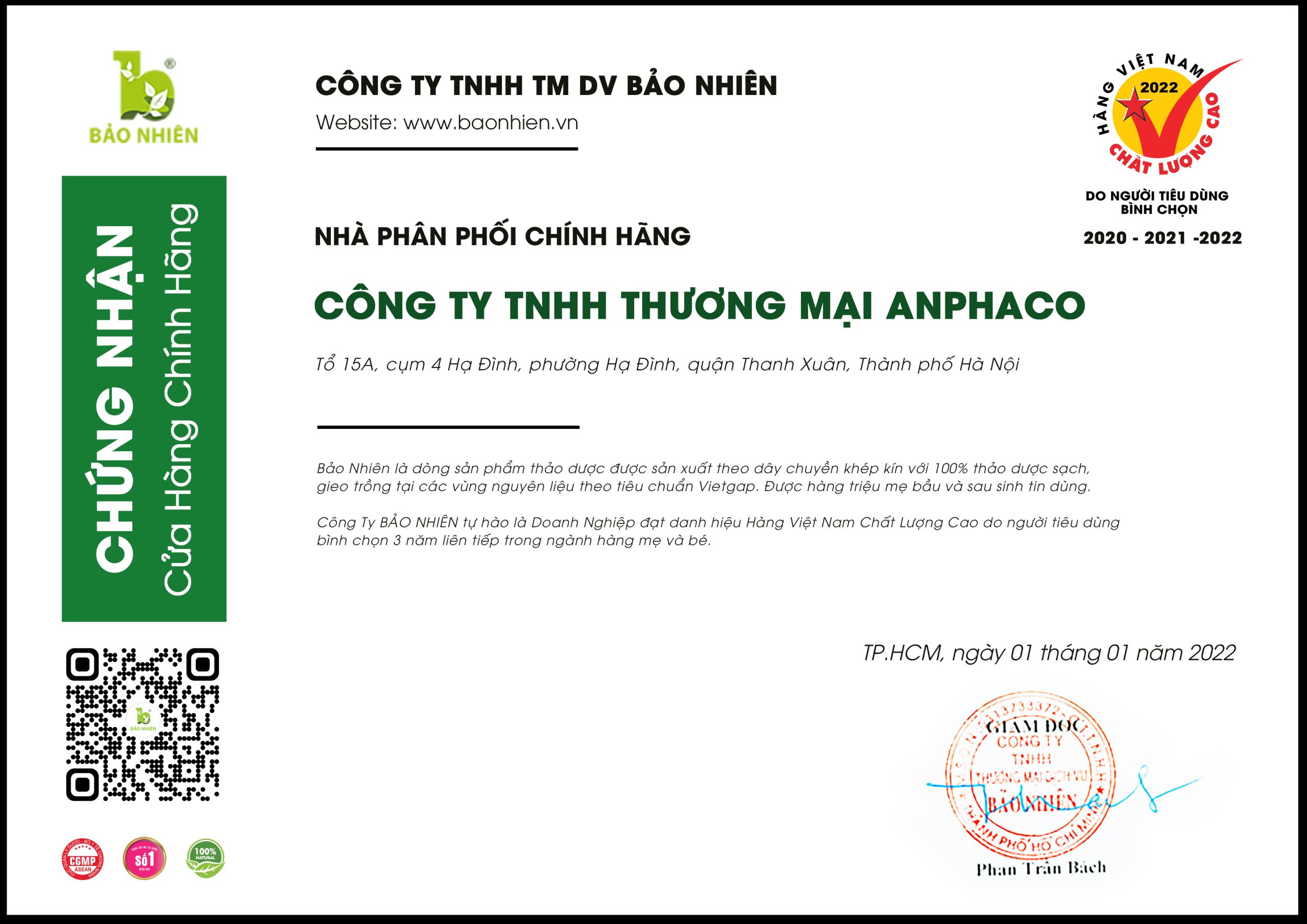 Anphaco là nhà nhâp khẩu và phân phối các dòng thảo dược cho mẹ và bé. Hiện tại, các sản phẩm mang thương hiệu Bảo Nhiên đang được Anphaco phân phối vào hầu hết các shop mẹ và bé trên toàn quốc. Vì vậy, các mẹ có thể yên tâm khi mua hàng tại webside công ty.